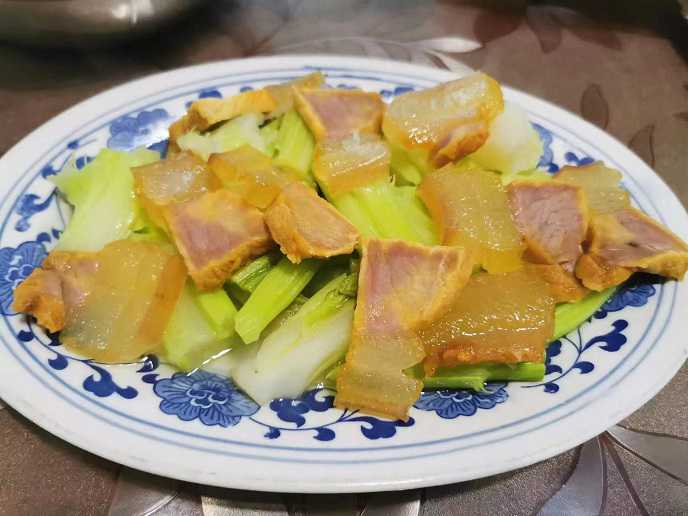 咸肉的油咸味被释放了出来流到了菜芯上,整个菜的味道就出来了,这种菜也是偶尔吃吃,毕竟自己腌的咸肉有限啊!